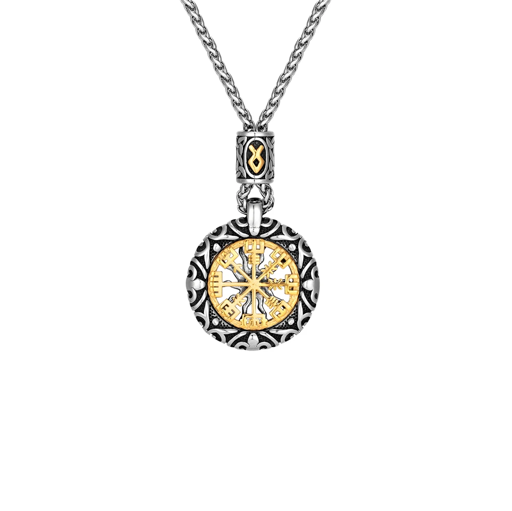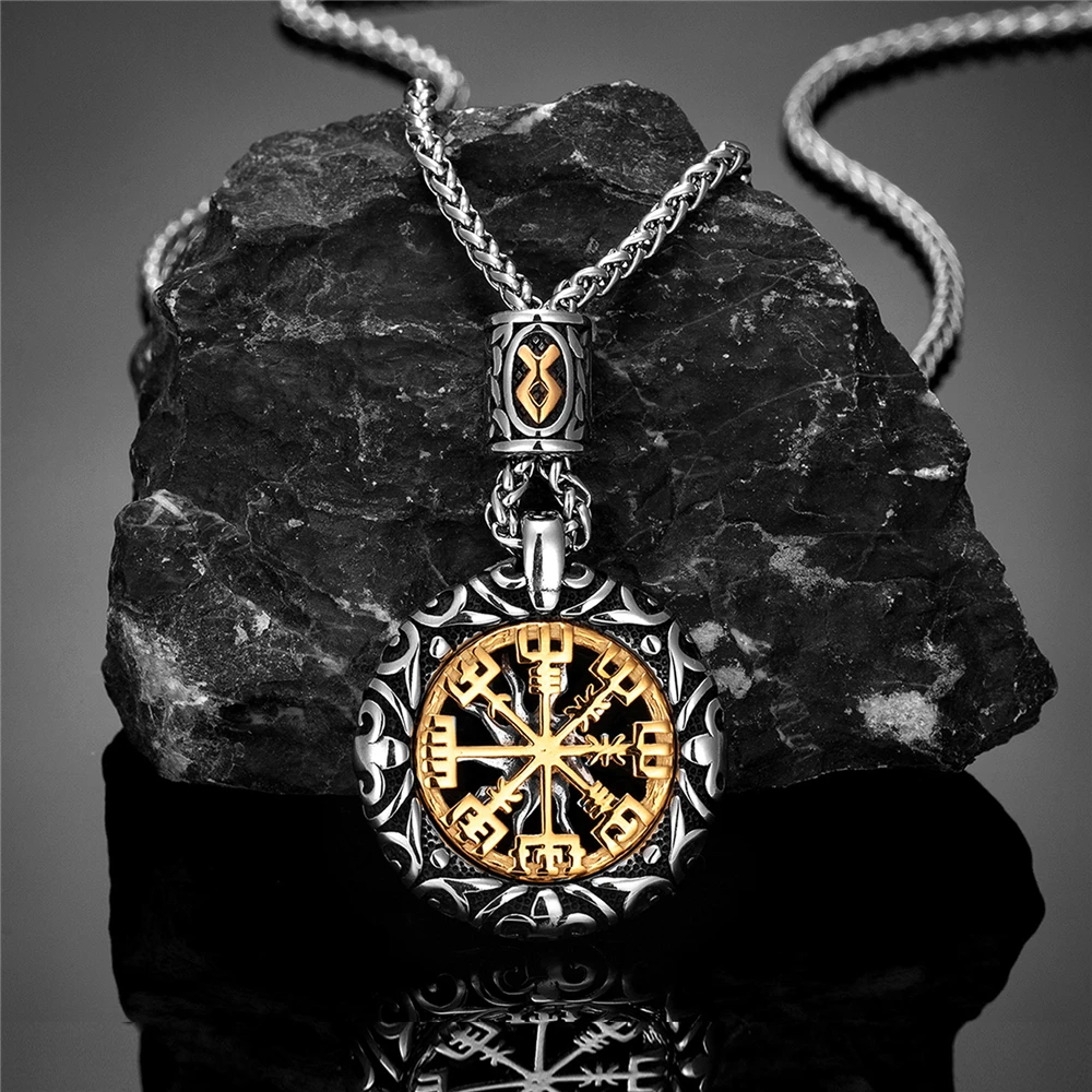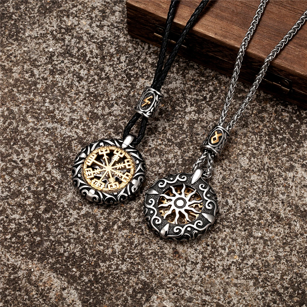 Retro Men Norse Rune Bead Compass Necklace Gold Color Hollow Out Sun Pendant Stainless Steel Vegvisir Amulet Male Viking Jewelry