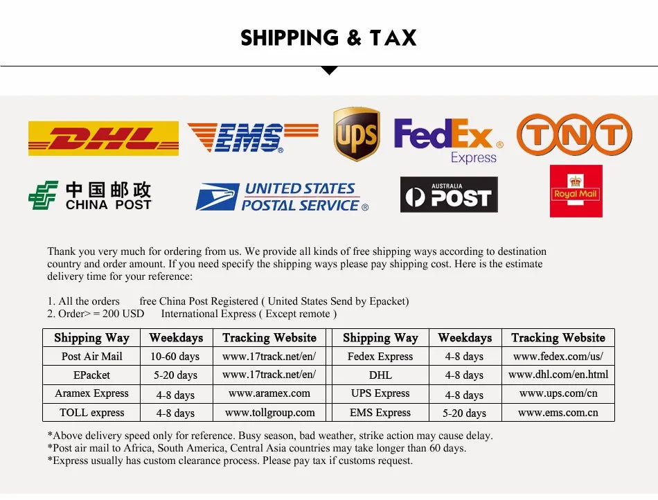 A:The order could be sent out within 1-3 days. The delivery time needs around 12-35 working days by China Post Air Mail and aroud 3-5 working days byDHL/FEDEX/UPS/EMS